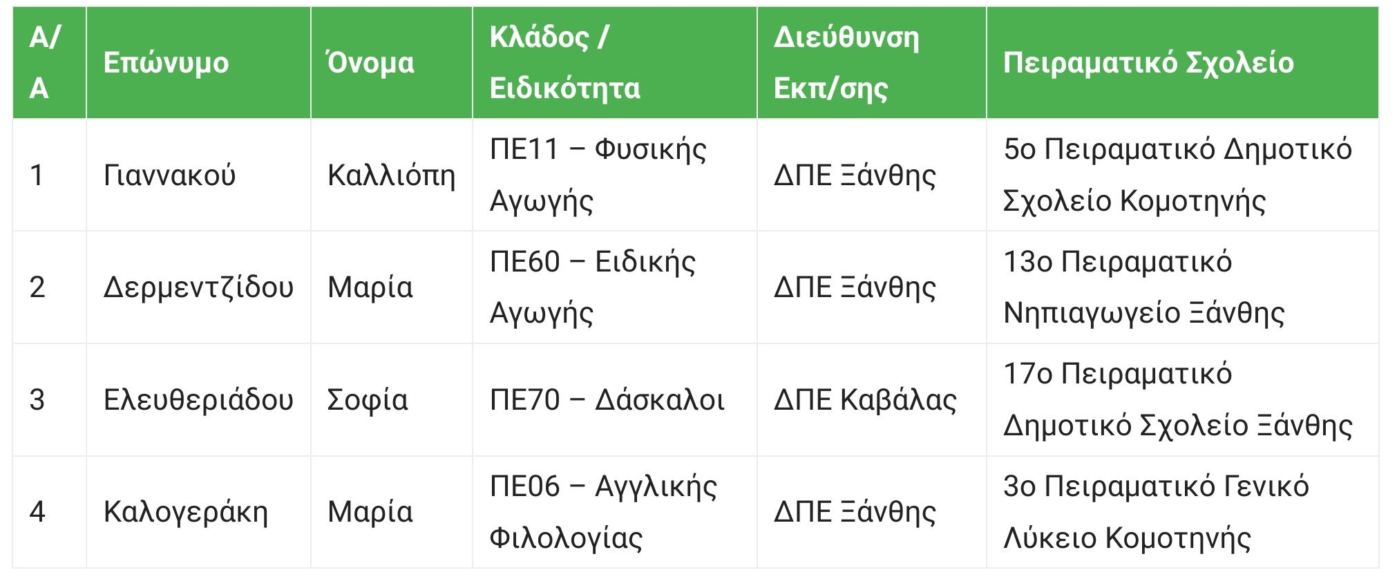 Οι αποσπάσεις σχετικά με την Ξάνθη εμφανίζονται στον παρακάτω πίνακα.