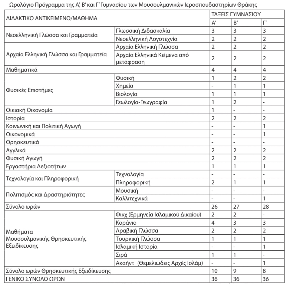 Το Ωρολόγιο Πρόγραμμα των μαθημάτων της Α’, Β’ και Γ’ τάξης Γυμνασίου των Μουσουλμανικών Ιεροσπουδαστηρίων Θράκης διαμορφώνεται ως εξής: