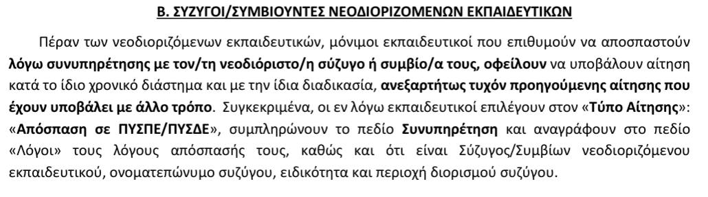 Δίνεται ομως η δυνατότητα στους μόνιμους εκπαιδευτικούς που είναι σύζυγοι ή συμβίοι νεοδιόριστων να υποβάλουν αίτηση απόσπασης λόγω συνυπηρέτησης, ώστε να τοποθετηθούν στην ίδια περιοχή με τον ή τη νεοδιόριστο. Η διαδικασία γίνεται ηλεκτρονικά μέσω του ΟΠΣΥΔ, με συμπλήρωση του πεδίου «Συνυπηρέτηση» και αναφορά στον λόγο της αίτησης ως «σύζυγος/συμβίων νεοδιόριστου εκπαιδευτικού».