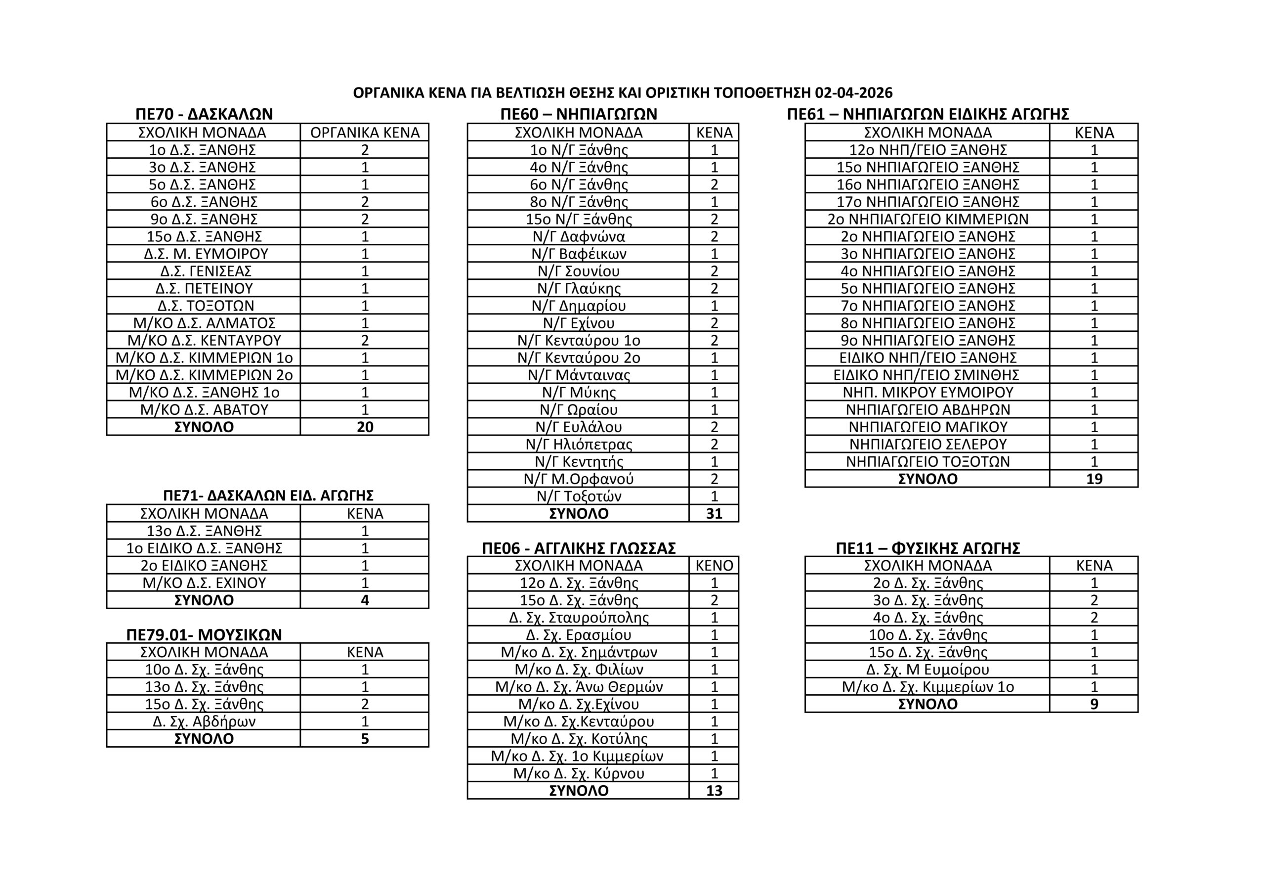 Ανακοινώθηκαν τα οργανικά κενά της Πρωτοβάθμιας Εκπαίδευσης Ξάνθης. Οι εκπαιδευτικοί (μετατεθέντες, σε διάθεση ή αιτούντες βελτίωσης) καλούνται να υποβάλουν έως 20 προτιμήσεις στο https://teachers.minedu.gov.gr από 03-04-2026 έως 07-04-2026. Οι εκπαιδευτικοί μπορούν να συμπεριλάβουν στις επιλογές τους οποιαδήποτε σχολική μονάδα επιθυμούν, ακόμη και αν δεν εμφανίζεται στα τρέχοντα οργανικά κενά, καθώς ενδέχεται να προκύψουν νέα από τις μετακινήσεις άλλων εκπαιδευτικών.