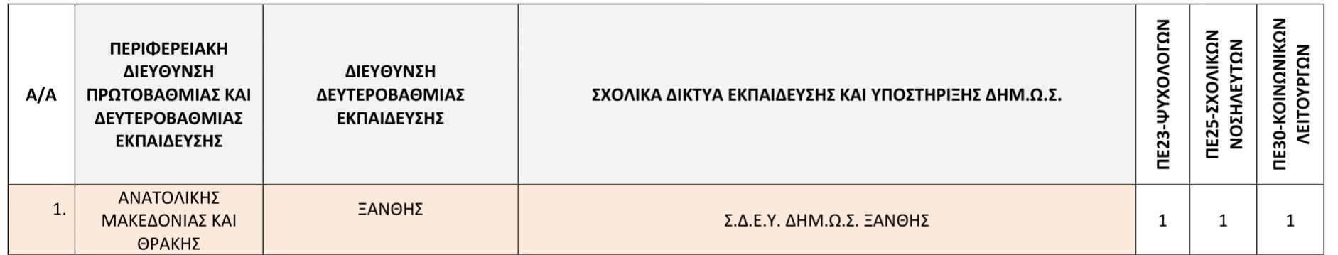 Τα κενά στην Ξάνθη εμφανίζονται στον παρακάτω πίνακα.