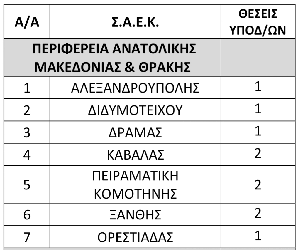 Οι θέσεις υποδιευθυντών για τις ΣΑΕΚ της Ανατολικής Μακεδονίας και Θράκης εμφανίζονται στον παρακάτω πίνακα.